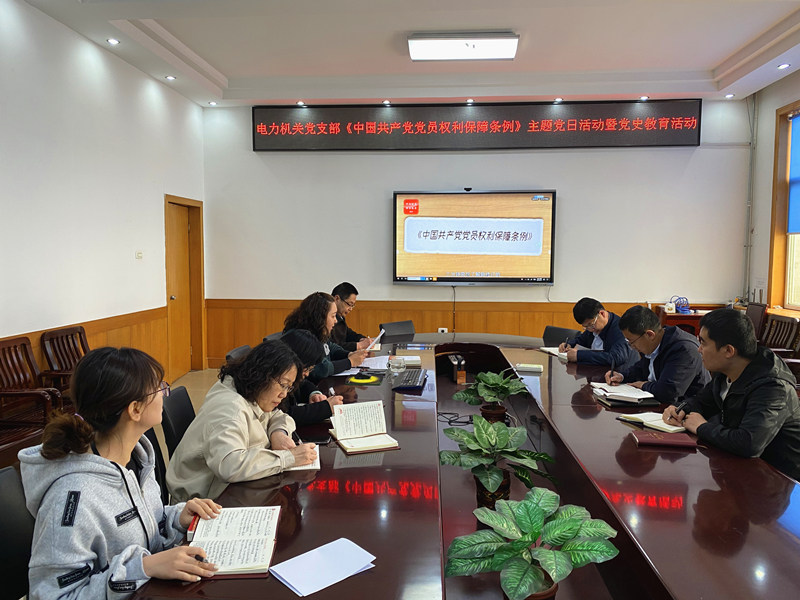 为深入学习贯彻新修订的《中国共产党党员权利保障条例》,不断强化党员权利意识,4月15日下午在电机馆223会议室,电力机关党支部进行了主题党日活动,组织党员集中学习了《中国共产党党员权利保障条例》(以下简称《保障条例》),集中观看《保障条例》解读视频及通过学习强国平台上的《党史故事100讲》典型事例,进行中国共产党简史学习,党支部书记姚丽娟主持,支部全体党员及入党积极分子参加。