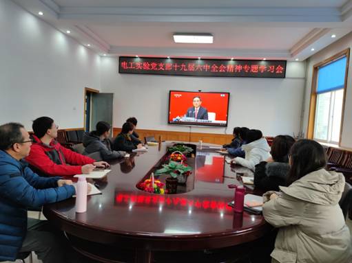 2021年12月21日下午,电工及实验党支部在电机馆223会议室集体观看学习了十九届六中全会精神,全会全面总结党的百年奋斗重大成就和历史经验,通过了《中共中央关于党的百年奋斗重大成就和历史经验的决议》,充分体现了党立足当下、着眼未来、注重总结和运用历史经验的高瞻远瞩和深谋远虑。