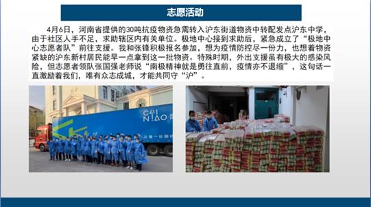 支部党员邢治瑞以“中国极地研究中心抗疫侧记”为题,讲述自己在上海疫情防控期间的生活和抗疫感悟。“爱国、拼搏、求实、创新”是南极精神的内涵,也是书写中国极地考察30多年传奇的基石。面对疫情,为了确保中国第38次南极考察队稳妥归来,队员平安回家,作为联合培养研究生的邢治瑞积极配合中国极地研究中心提前部署,积极协助极地中心科研团队和业务管理部门开展浦东金桥院区的工作。疫情防控关键时期,河南省提供的30吨抗疫物资急需转入沪东街,社区人手不足,求助辖区内有关单位。极地中心接到求助后,紧急成立了“极地中心志愿者队”前往支援。志愿者队贯彻“疫情当前,党员先上”的信念,诠释了“南极精神就是勇往直前,疫情亦不退缩”的誓言,关键时刻勇于担当、无私奉献。