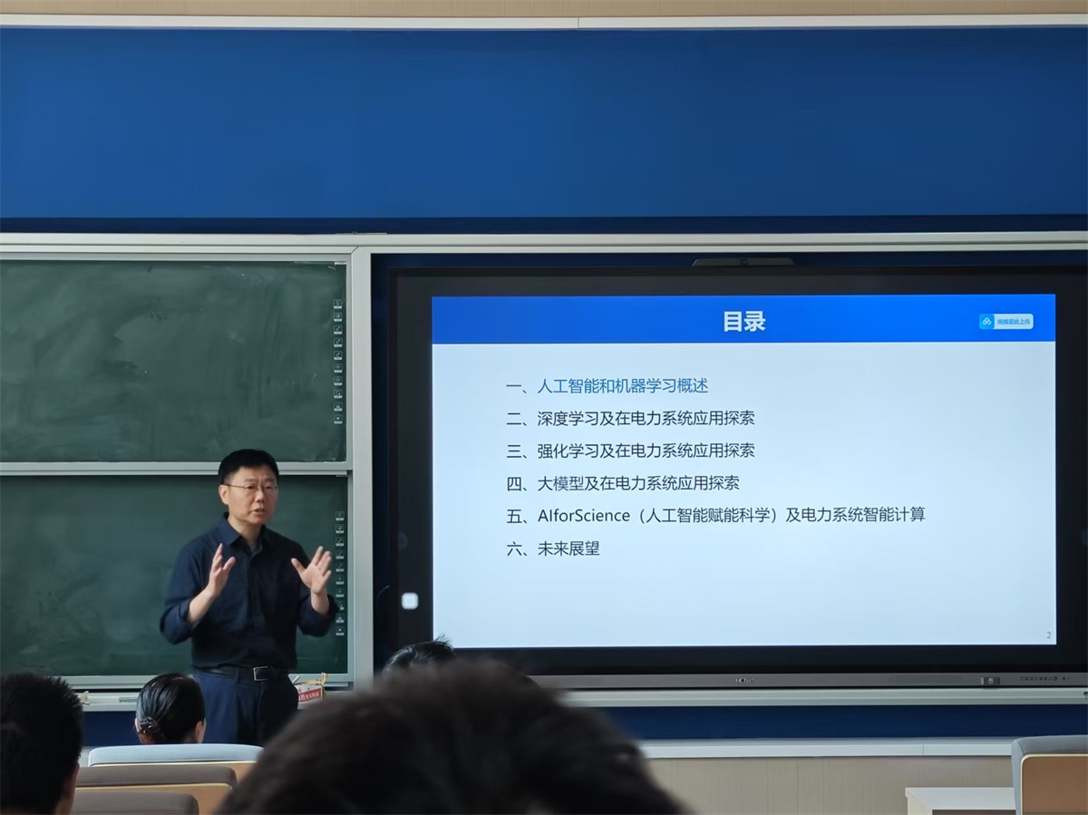 张沛教授从人工智能的基本概念出发,系统介绍了机器学习、深度学习、强化学习及大模型等技术在新型电力系统中的创新应用。他结合团队的最新研究成果,详细阐述了深度学习在光伏发电功率预测、强化学习在配电网负荷转供与动态经济调度中的实践,以及大模型在电力系统调度运行中的潜在价值。此外,张沛教授还分享了“AI for Science”这一前沿方向,探讨了人工智能如何赋能电力系统智能计算,为解决复杂科学问题提供新范式。活动后,实验室负责人韩肖清教授与张沛教授进行了交流,希望双方通过此次报告增进了解,共同助力双方团队建设、人才培养及科研合作等。