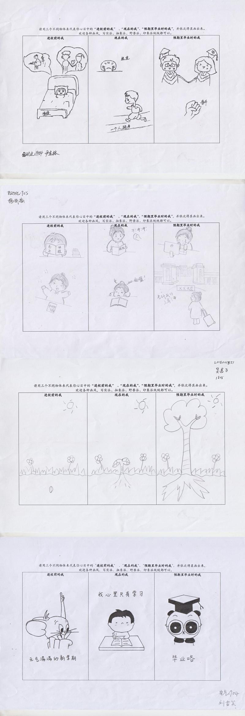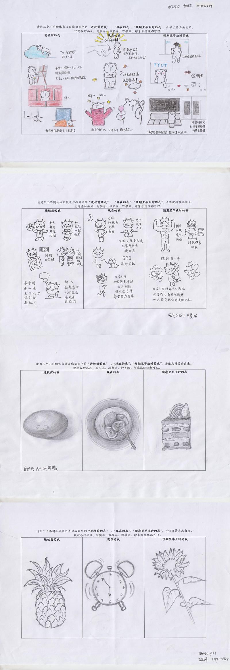 通过一一阅览作品,看到同学们在高中阶段、大学阶段、毕业前景三个阶段的心理变化,高中时期学习目标明确,面对激烈的高考充满冲劲,憧憬老员工活、向往校园爱情;大学时期专业学习难度加大时的迷茫,向往爱情而不得的孤独,兴趣与学业的冲突碰撞等;毕业预期时顺利拿到学位证书、考研成功、获得的爱情、友情以及走出大公司园的不舍、跃入人海放手一搏的期待等。同学们画风多样,通过可爱的卡通人物、图文搭配的形式将过去、现在、将来的我真实巧妙地呈现出来。
