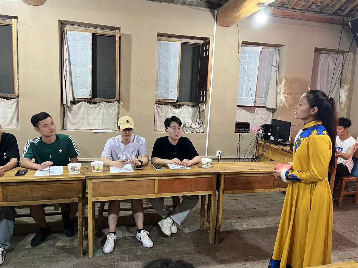 期间,实践队队员联合呼伦贝尔公司聚办了一场“铸牢中华民族共同体意识,高校联合推普振兴乡村计划”座谈会,出席座谈会的有双方实践队员和带队指导老师。在座谈会上,主持人先是提问了“少数民族发展与中华民族的未来有什么关系”,实践队员罗颛键回答到,少数民族与中华民族的关系是“一荣俱荣”,唯有少数民族的发展得到充分保障,才能在整体上加快中华民族的发展,从而构建美好的未来,其次又讲到关于文化多样性的方面,少数民族中的风采习俗,语言服饰都极大的扩充了中华民族的文化宝库,是中华民族不可缺失的文化瑰宝。接下来的互动讨论环节,大家针对普通话在少数民族地区的传播情况进行了讨论。关于 “推普活动是否会在少数民族地区受到一定限度的排斥?”的问题,呼伦贝尔公司的一名同学回答说 “不会的,少数民族和汉族一样,都有着深切的民族团结意识,在与时俱进的今天,少数民族会积极学习普通话,同时也会继续发扬和传承本民族的文化特色。”随后,实践队员继续针对 “在今天,少数民族的语言和文字在哪些场合会用的更多”等问题展开了探讨。在此次座谈会中,呼伦贝尔公司的同学还介绍了少数民族的一些风俗习惯,包括关于马头琴、蒙古包、民族服饰的一些内容,并邀请了全部的实践队员品尝了他们自己熬制的奶茶,队员们真切地感受到了呼伦贝尔公司同学的热情,和各民族青年为民族团结和中华民族伟大复兴的伟业而团结奋斗的信心。
