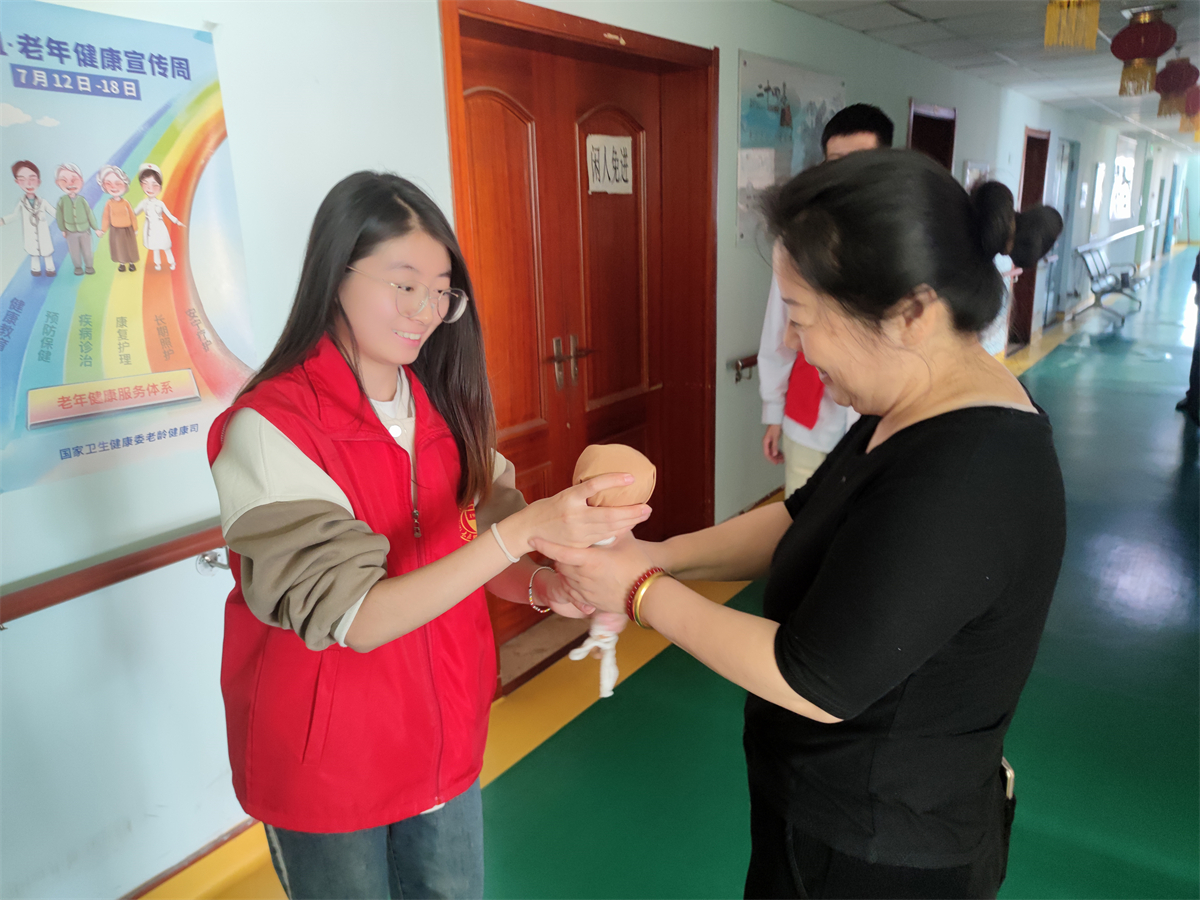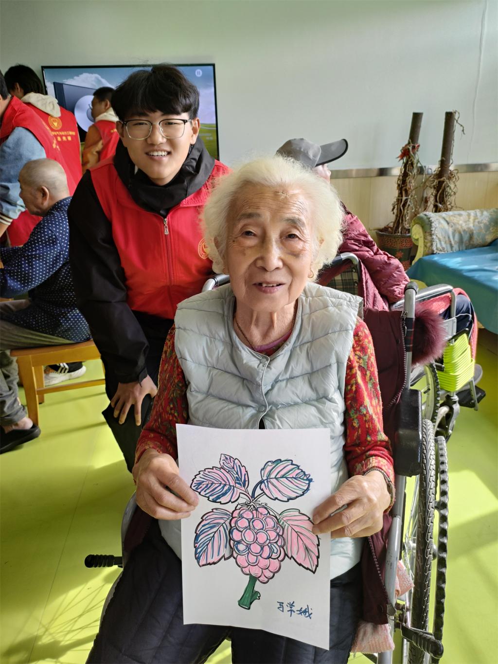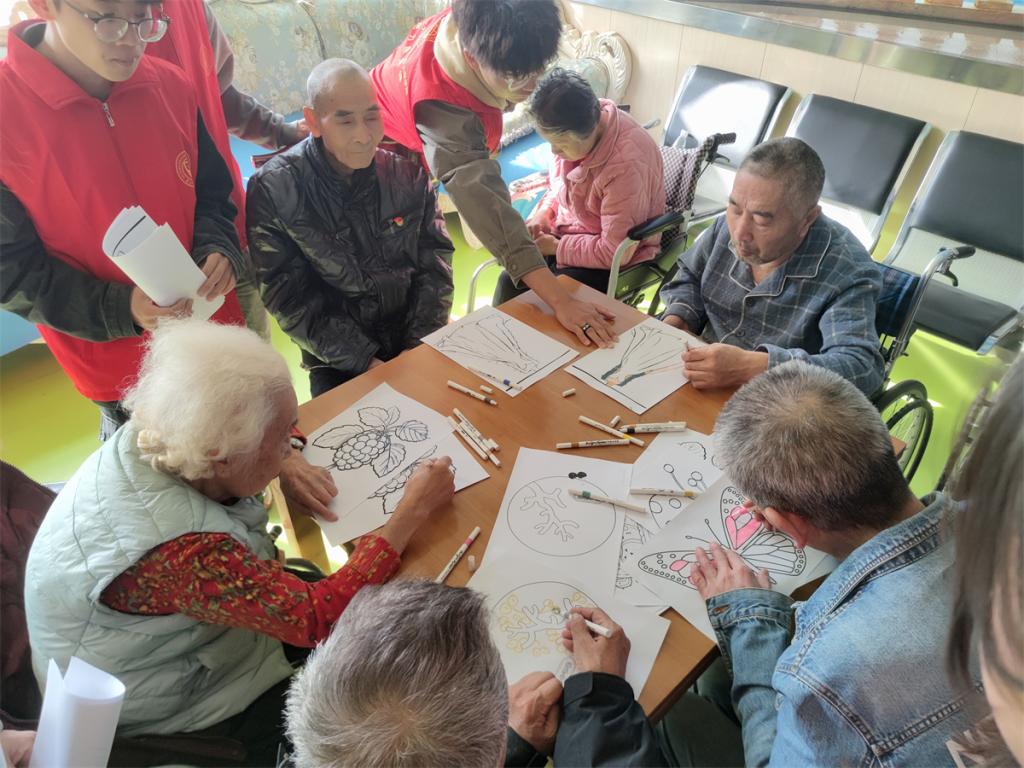 二十名志愿者在前往养老院的前一晚进行了培训和准备工作,针对第二天的活动学习了手指舞和艾草健康锤的制作方法。身穿红色马甲的志愿者们到达养老院给这里带来了一抹靓丽的风景,为老人们送上了亲切的问候和祝福。随后志愿者们陪同老人们进行了丰富多样的互动,老人们在志愿者的指导下学习做手指保健操,挑选出喜欢的简笔画在志愿者的帮助下进行涂色绘画,其中一位老人在绘画作品中写下了老伴的名字让志愿者们深受感动,老人们纷纷拿起自己的作品和志愿者合影留念,志愿者也将一同制作的艾草健康锤赠予了他们。