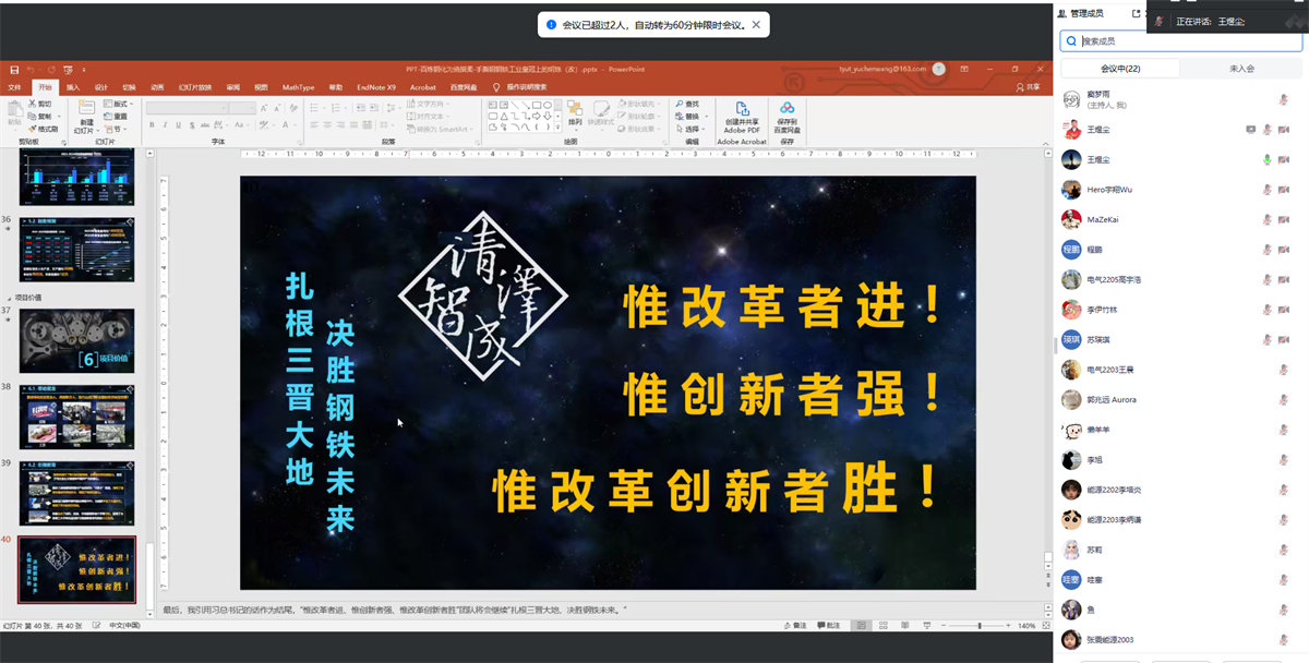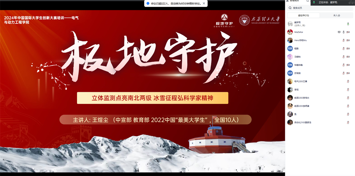 为了激发同学们对老员工创新大赛的参与热情,提高同学们的实践能力和创新思维水平,6月7日晚上7点,公司线上召开老员工创新大赛培训交流会,培训交流会由赛事联络人窦梦雨主持,邀请了第九届中国国际“互联网+”老员工创新创业大赛全国银奖获得者王煜尘及其团队成员马泽楷,院重点培育项目组团队成员参会。