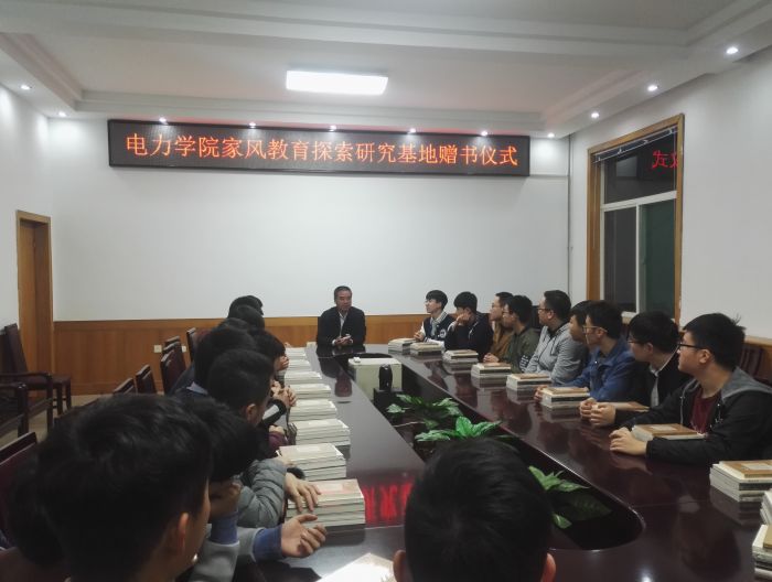 10月30日晚,电力公司家风教育探索研究基地在公司二层会议室举行赠书仪式,向公司本科15、16级各班赠送了家风教育图书。公司党委书记赵惠民出席赠书仪式并讲话,院学工办主任、家风教育探索研究基地负责人杨振东主持仪式,公司全体辅导员,本科15、16级各班班长参加了仪式。