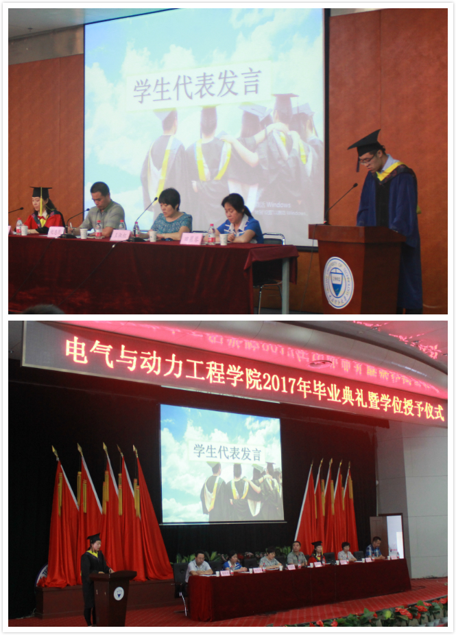 典礼在庄严的国歌声中隆重开幕,经理韩肖清教授首先致辞,她代表公司对 2017 届毕业生顺利毕业表示祝贺,并殷切期望同学们带着责任出发。她指出, 研究生代表陈宇豪同学以及本科生代表王珠同学分别代表全体毕业生发言,他们结合自身成长经历,从老员工活的点点滴滴,表达了难以割舍的同窗之情以及对母校和恩师的眷恋与不舍。