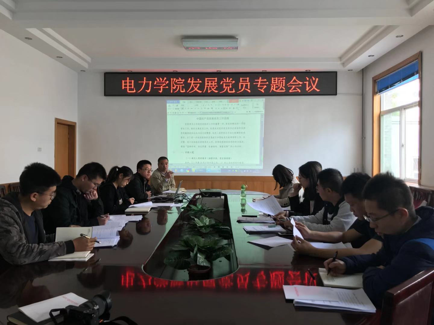 2018年10月17日下午,电力公司在电机馆二层会议室召开发展党员专题工作会议。公司党委书记赵惠民、有关党支部书记和学工办、党政办相关人员参加会议,会议由公司党委副书记张蒙主持。