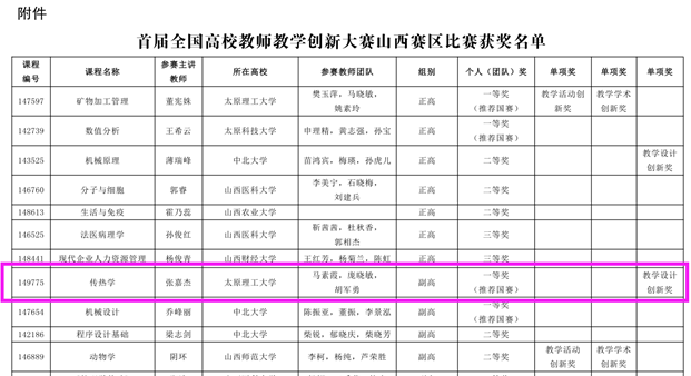 近日,山西省教育厅公布了首届全国高校教师教学创新大赛山西赛区比赛获奖名单,公司热能工程系教师张嘉杰获得副高组一等奖(第一名)。
