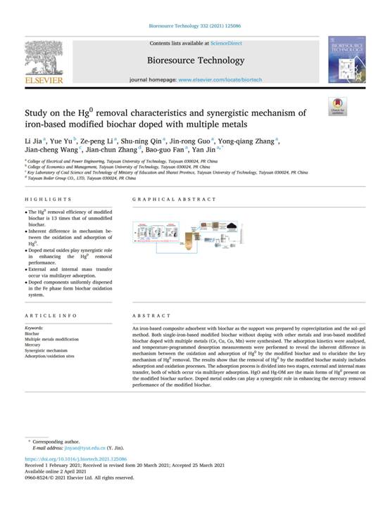 根据Essential Science Indicators(简称ESI)2022年5月公布的最新统计结果,公司青年教师贾里副教授发表于《Bioresource Technology》的论文《Study on the Hg0 removal characteristics and synergistic mechanism of iron-based modified biochar doped with multiple metals》入选ESI高被引论文。该论文以pa集团官网入口为第一署名单位,金燕教授为唯一通讯作者。《Bioresource Technology》为爱思唯尔(Elsevier)出版公司旗下的能源环境领域顶级期刊(中科院一区TOP,近3年平均IF=7.95)。