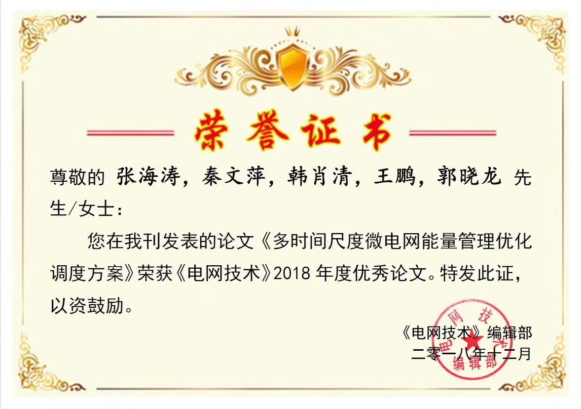 由我重点实验室张海涛、秦文萍、韩肖清、王鹏、郭晓龙共同撰写的论文《多时间尺度微电网能量管理优化调度方案》因“被引频次和下载频次均较高”,被《电网技术》期刊社评选为2018年度优秀论文。2018年,《电网技术》实现了期刊学术质量和社会影响力的双提升:荣获第四届“中国出版政府奖期刊奖提名奖”,并蝉联全国“百强报刊”荣誉;据中信所发布的《中国科技期刊引证报告(核心版)》,《电网技术》综合评价总分在电气工程类核心期刊排名第2;连续6年荣获“中国最具国际影响力学术期刊”称号。